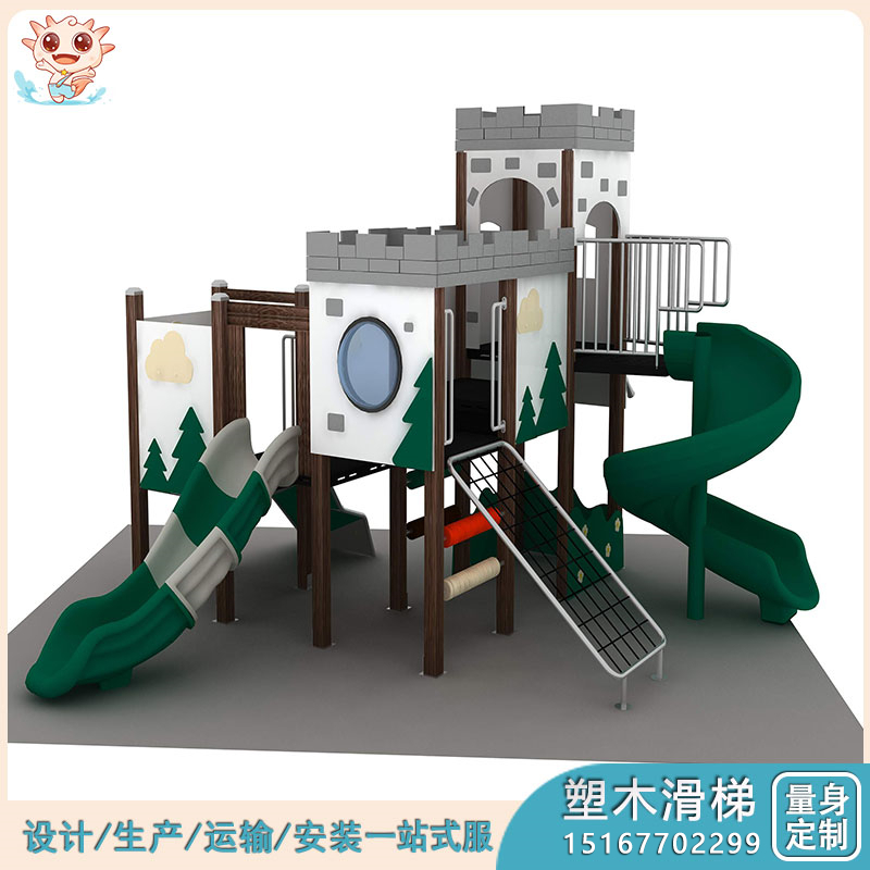 【产品材质】仿木原木滑梯主要使用塑木、镀锌管、镀锌管、工程塑料、304不锈钢 、PE板、不锈钢螺丝制作