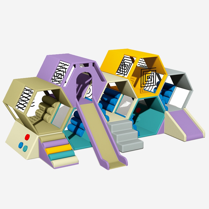 这是一款针对低龄儿童触觉与空间感知发展刚需设计的蜂巢式软体游乐组合,由多个独立六边形软包模块构成,可快速拼接成立体迷宫、钻爬隧道、攀爬架等探索场景。孩子在触摸不同纹理、穿梭蜂巢结构的过程中,能自然提升触觉敏感度与空间逻辑能力,全软包结构从根源规避磕碰风险,适配幼儿园感官教育、早教专项训练及家庭启蒙游戏的多元需求,是一款兼具专业性与趣味性的创新型软体游乐器材。
