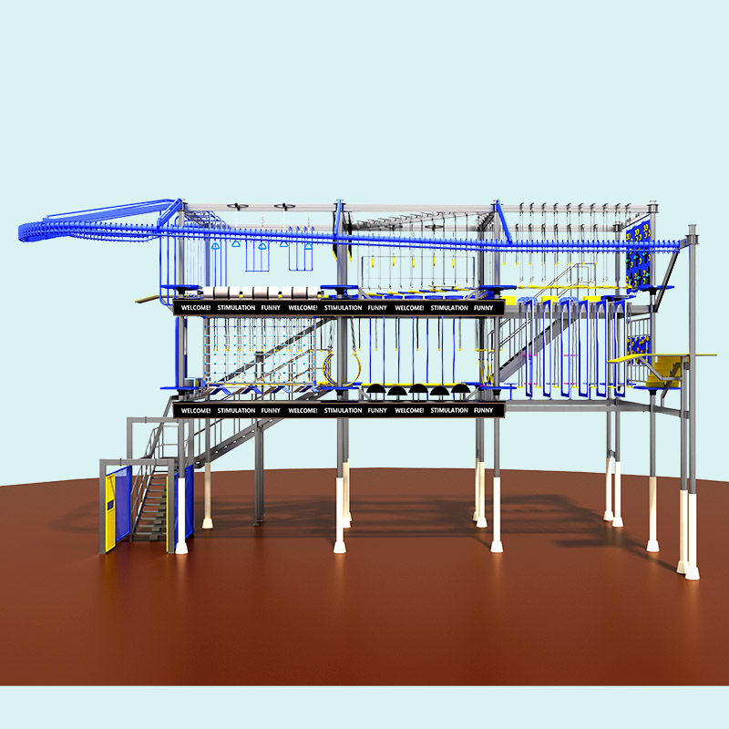 这款高空拓展设备以蓝黄撞色打造鲜明竞技视觉风格,搭配全钢架稳固金属质感框架与动态闯关关卡,打造充满活力与挑战的竞技场景。设备集成绳网穿越、平衡木、高空吊环、障碍闯关等 15 + 专业拓展模块,让孩子在高空场景中完成体能突破、勇气锤炼与团队协作,是室内乐园、商业体打造沉浸式游乐体验的核心设备,兼具游乐性与教育性,是打造潮玩拓展场景的核心设备。