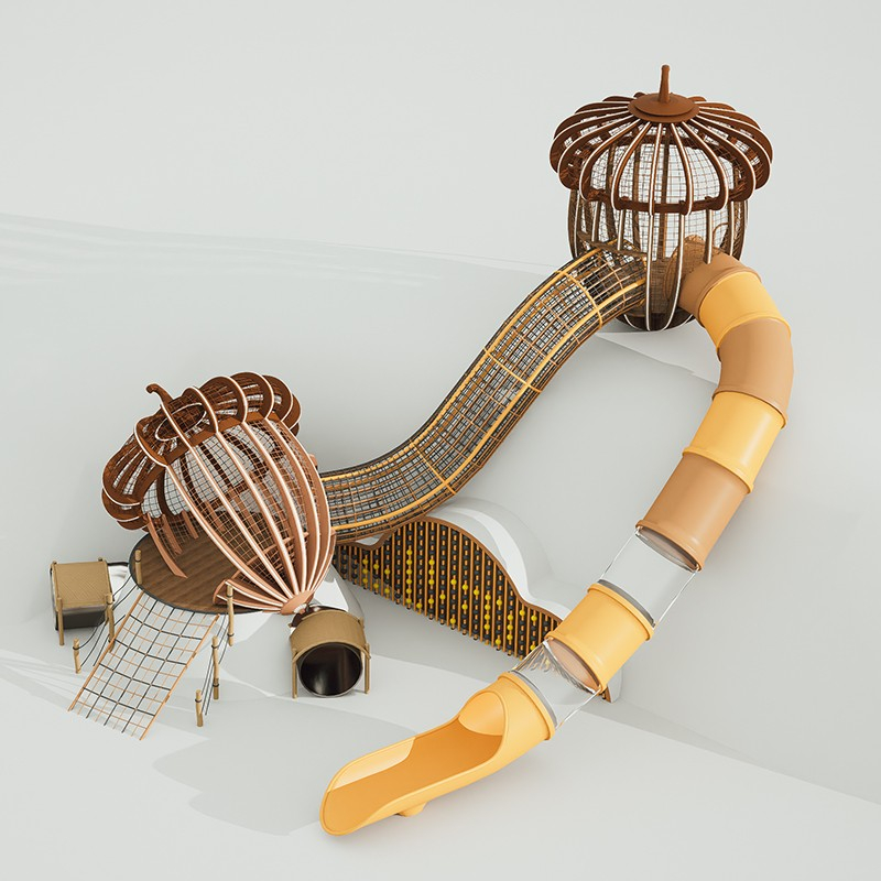 ![]() | 名称:松果滑梯 尺寸:849x687×611cm 数量:1 材质:六股钢丝绳、LLDPE、镀锌管、相思木、巴蒂木 |